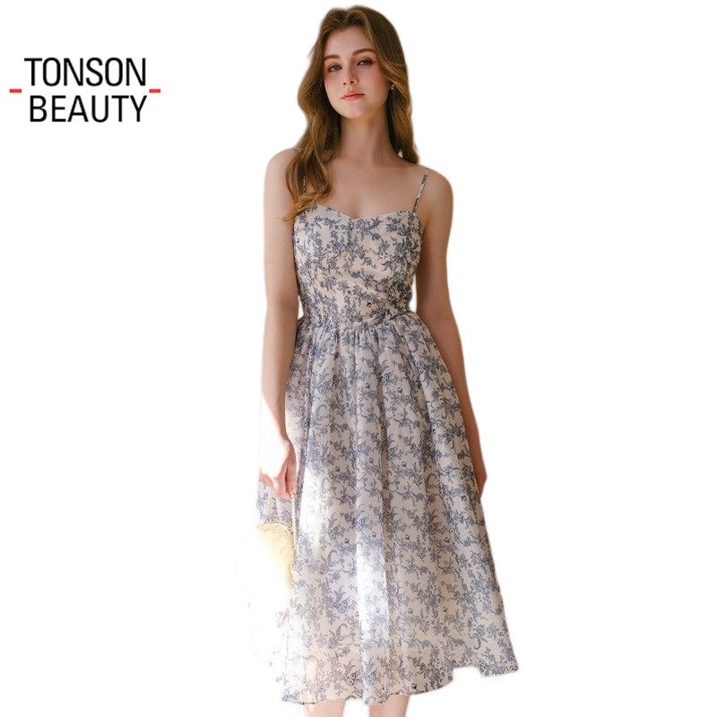 2026巨好看蓝色碎花吊带连衣裙女夏季绝美不撞款法式风度假长裙